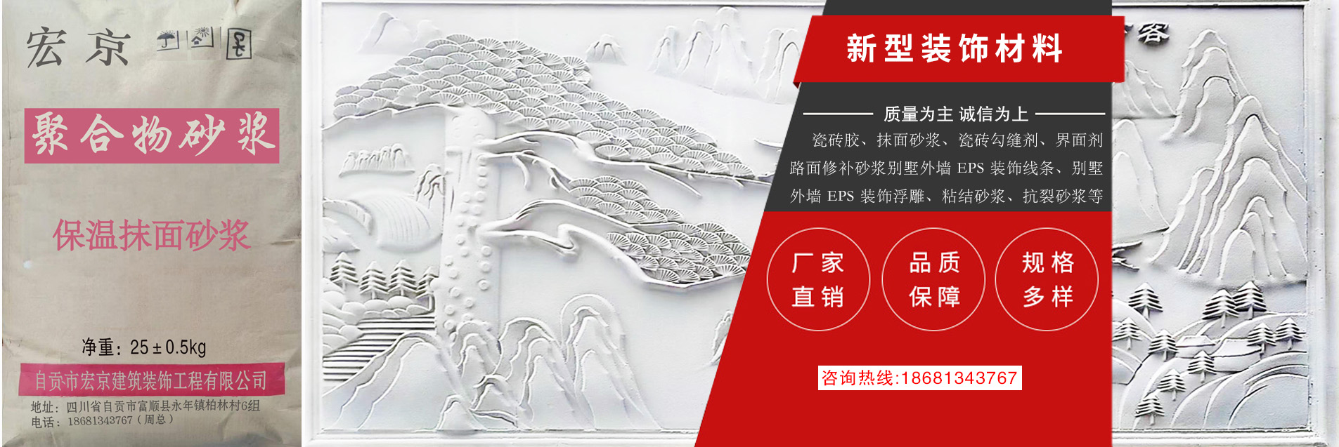 自貢市宏京建筑裝飾工程有限公司,成立于 2018 年,廠房位于位于四川省自貢市富順縣永年鎮(zhèn)柏林村 6 組柏林村小。本公司集保溫材料聚合物改性水泥基砂漿材料研發(fā)、生產、銷售于一體的干粉砂漿材料公司。 公司基于低碳、環(huán)保、綠色、節(jié)能的經(jīng)營理念,生產推廣高效、節(jié)能、環(huán)保的新型保溫材料等產品。本公司 產品具有質量優(yōu)良、良好技術、精湛工藝、成本低等優(yōu)勢。公司成立以來,一直視產品質量為企業(yè)的生命, 堅持“質量為先,顧客至上”的服務宗旨,贏得了客戶的信賴,并建立了完善的售前售后服務體系,歡迎各 界來